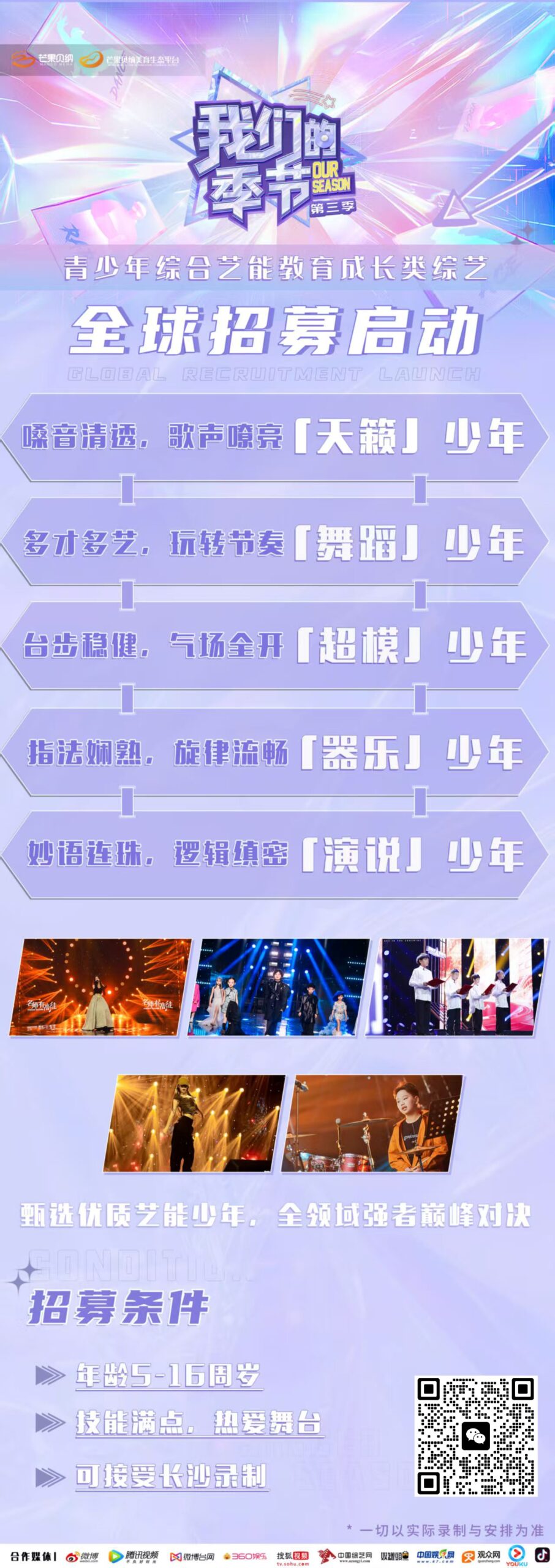 这一次,第三季全新升级!将在全球范围内选拔优秀艺能少年,让少年沉浸式体验卫视舞台录制,针对性提升少年的专业素养及舞台表现力,将德育、美育、教育、才育融为一体,提高少年的综合素质,创造舞台高光时刻!